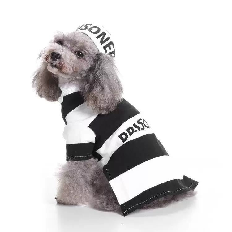1.Features a Striped Black and White Prison Uniform Dog Costume. Great when worn during Halloween or any time of year